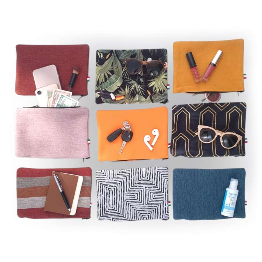 Per ridurre gli sprechi, trasformiamo i piccoli ritagli di tessuto dei nostri cuscini in pochette artigianali che regaliamo ad ogni ordine ai nostri clienti.